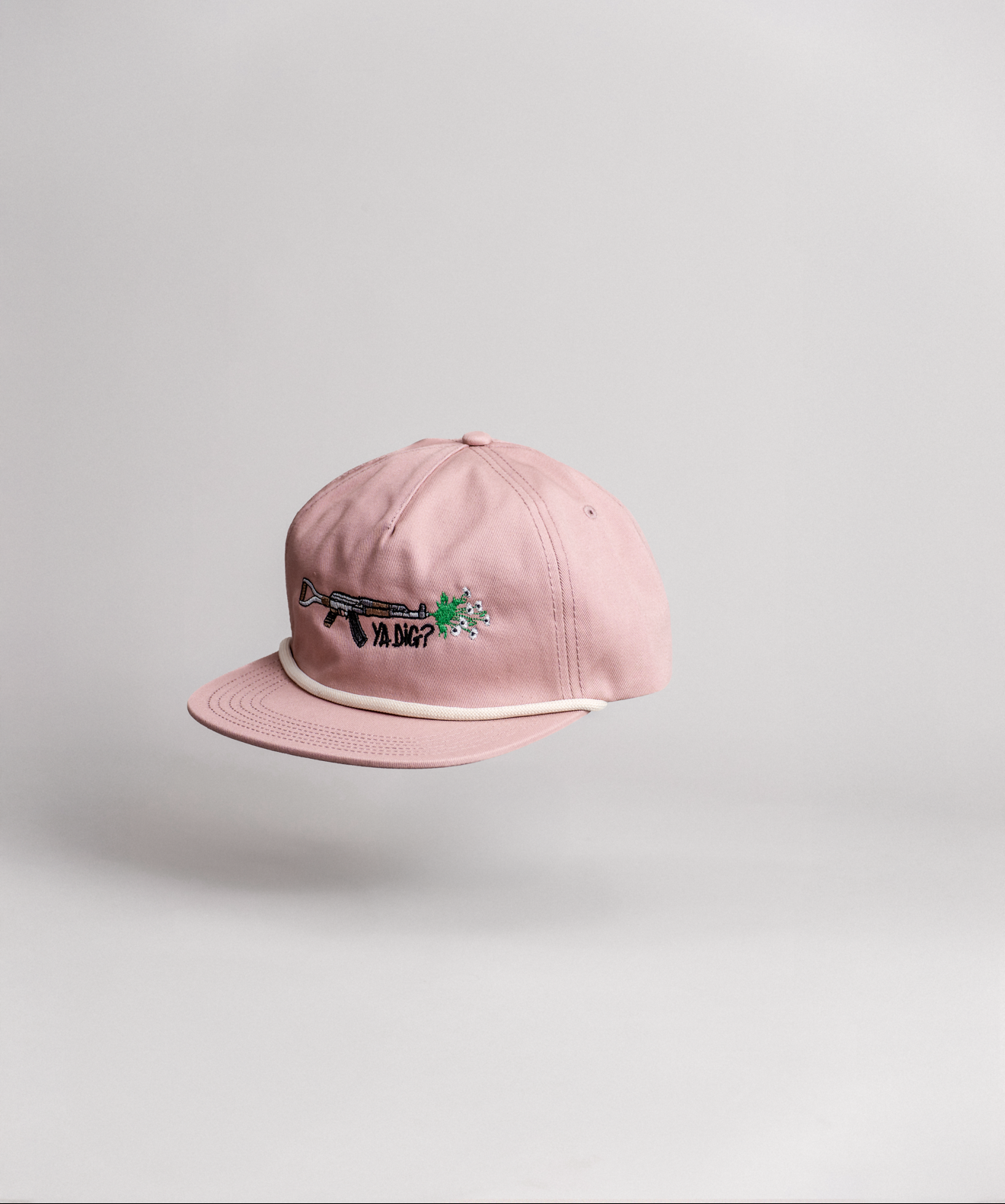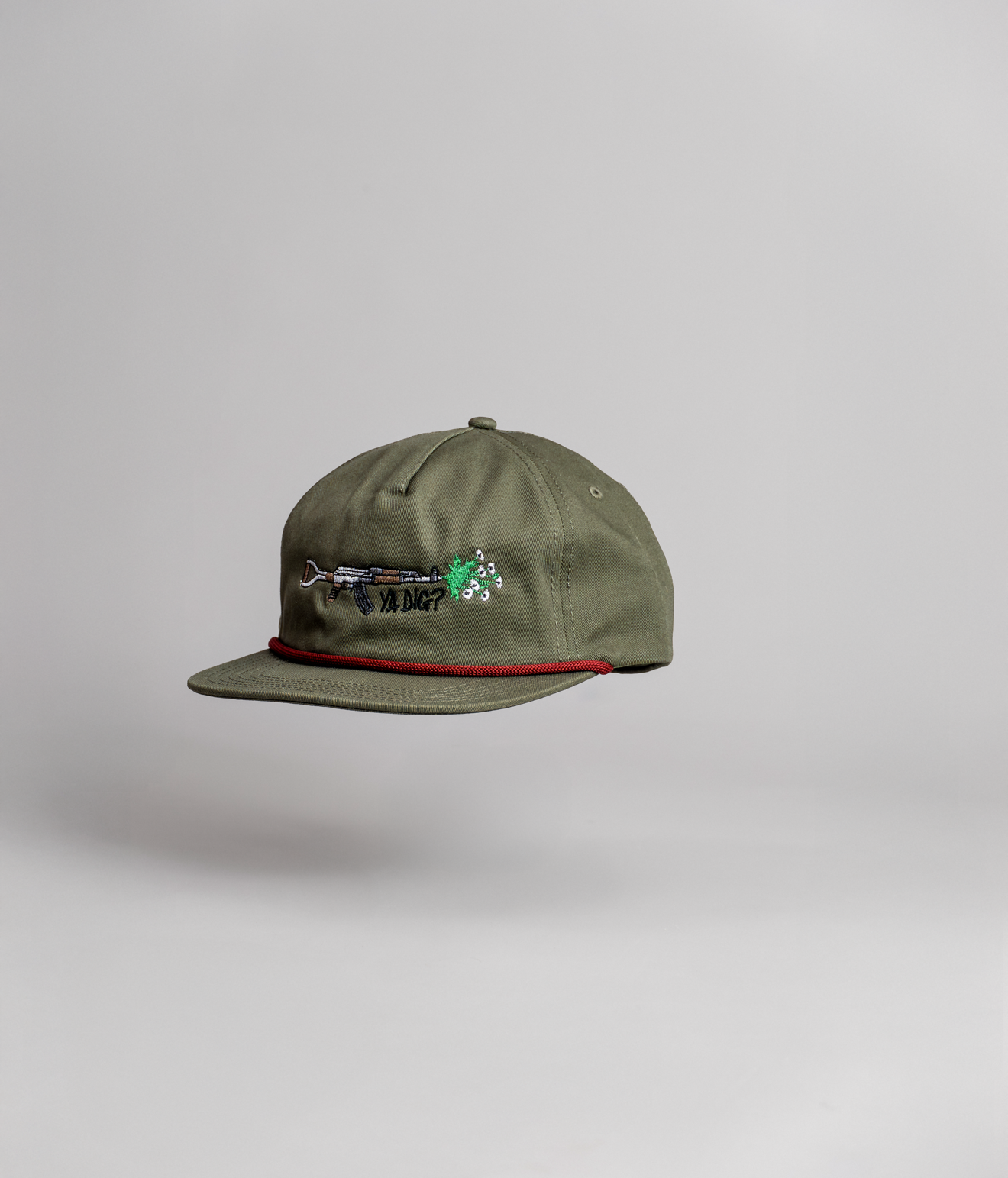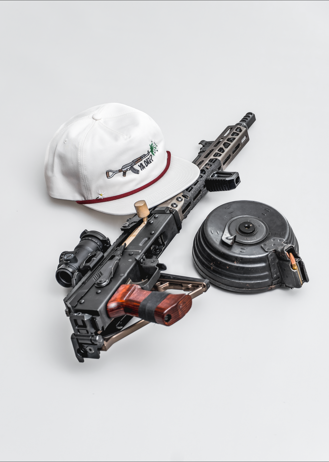 Show em you know ball with Goontape’s first ever 5-panel cap. The front features rich embroidery of a “gardener’s AKM” sporting a lovely bouquet coming from the muzzle and our classic JMAC Customs DITCH-DGR shovel stock.
